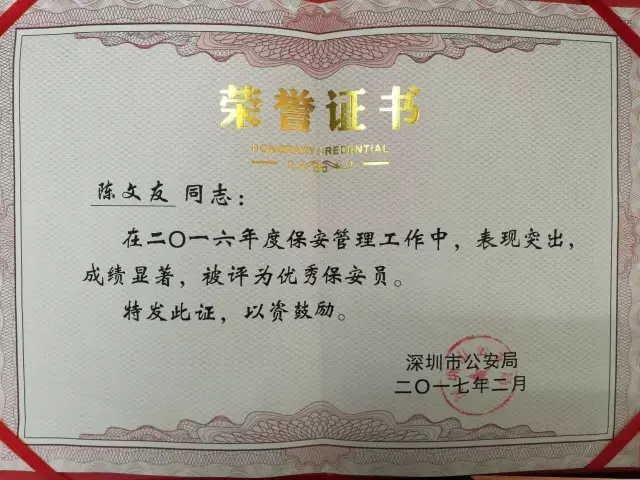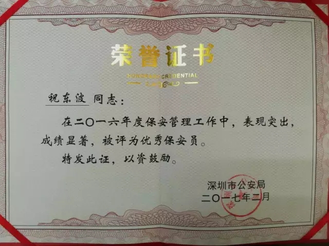 在國保安防集團保安公司獲得2016年度先進保安組織評定的同時,深圳市國保安防保安服務有限公司職員祝東波、王建明、陳文友被深圳市公安局評為“優秀保安員”,對其三人在2016年度保安管理工作中的優異表現進行了充分的肯定。