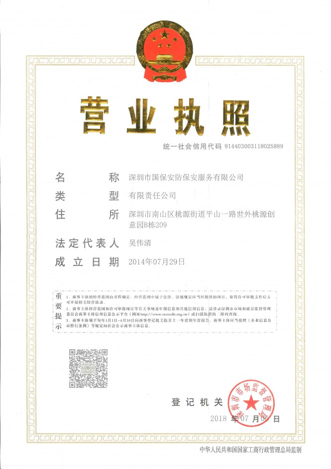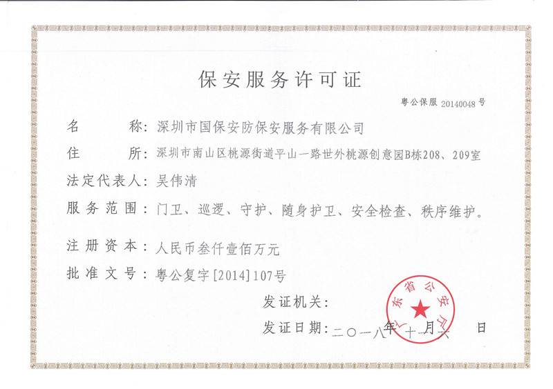 為適應(yīng)集團(tuán)總體戰(zhàn)略規(guī)劃要求,2018年11月,集團(tuán)下屬深圳市國保安防保安服務(wù)有限公司在深圳市市場監(jiān)督管理局和公安機(jī)關(guān)成功完成了《營業(yè)執(zhí)照》及《保安服務(wù)許可證》注冊資本的變更登記,公司注冊資本成功增資至3100萬元,集團(tuán)綜合實(shí)力和市場競爭力得到進(jìn)一步提升。