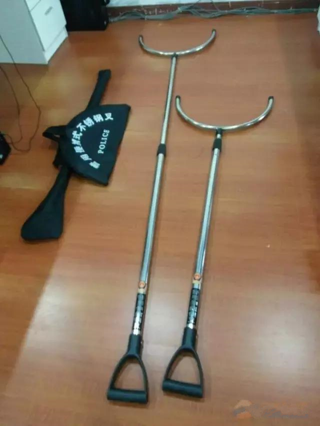 4.防爆鋼叉。防爆鋼叉主要用于對嫌疑人持菜刀、匕首等短兇器行兇時,可用鋼叉頂住嫌疑人腰腹部,控制好安全距離,避免受到傷害。