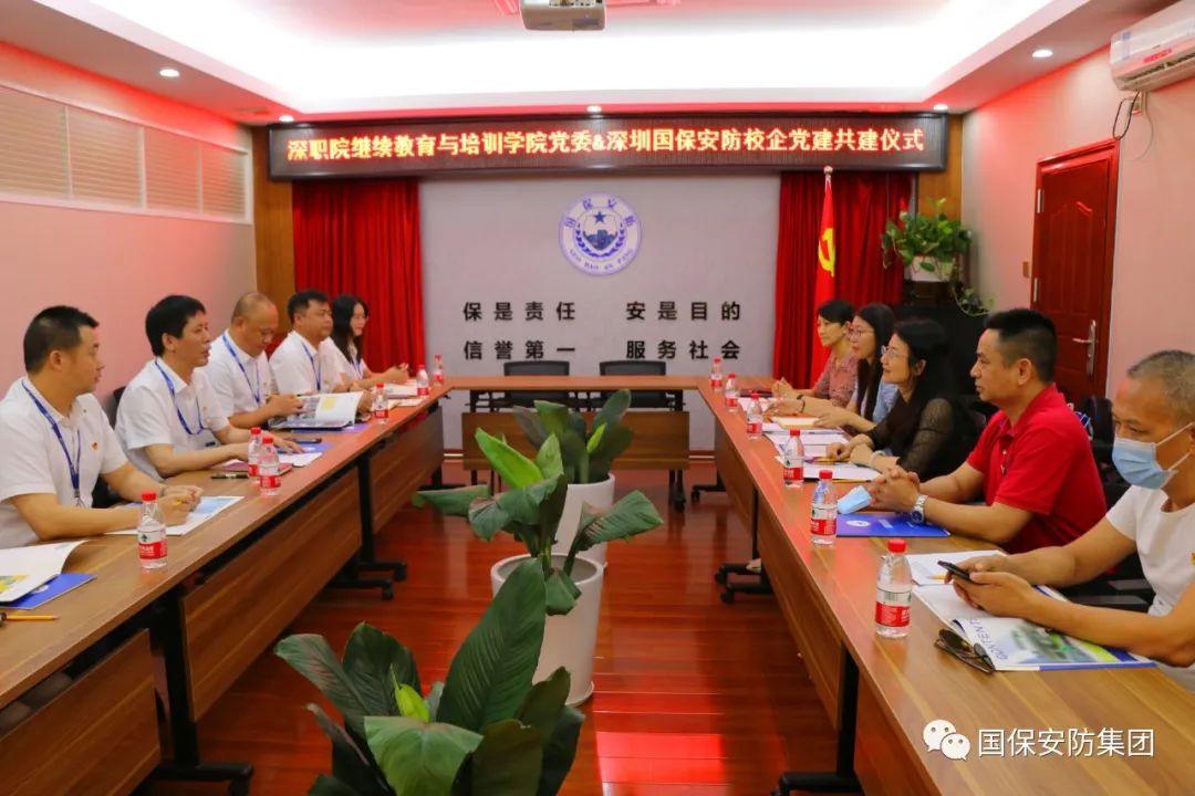 2022年6月17日下午,深圳國保安防集團與深職院繼續教育與培訓學院黨委的黨建共建協議簽訂儀式順利舉行。深圳國保安防集團黨支部書記、董事長吳偉清與深職院繼續教育與培訓學院黨委書記陳彩勤代表雙方簽約,雙方主要領導、黨員干部共計13人出席簽約儀式。